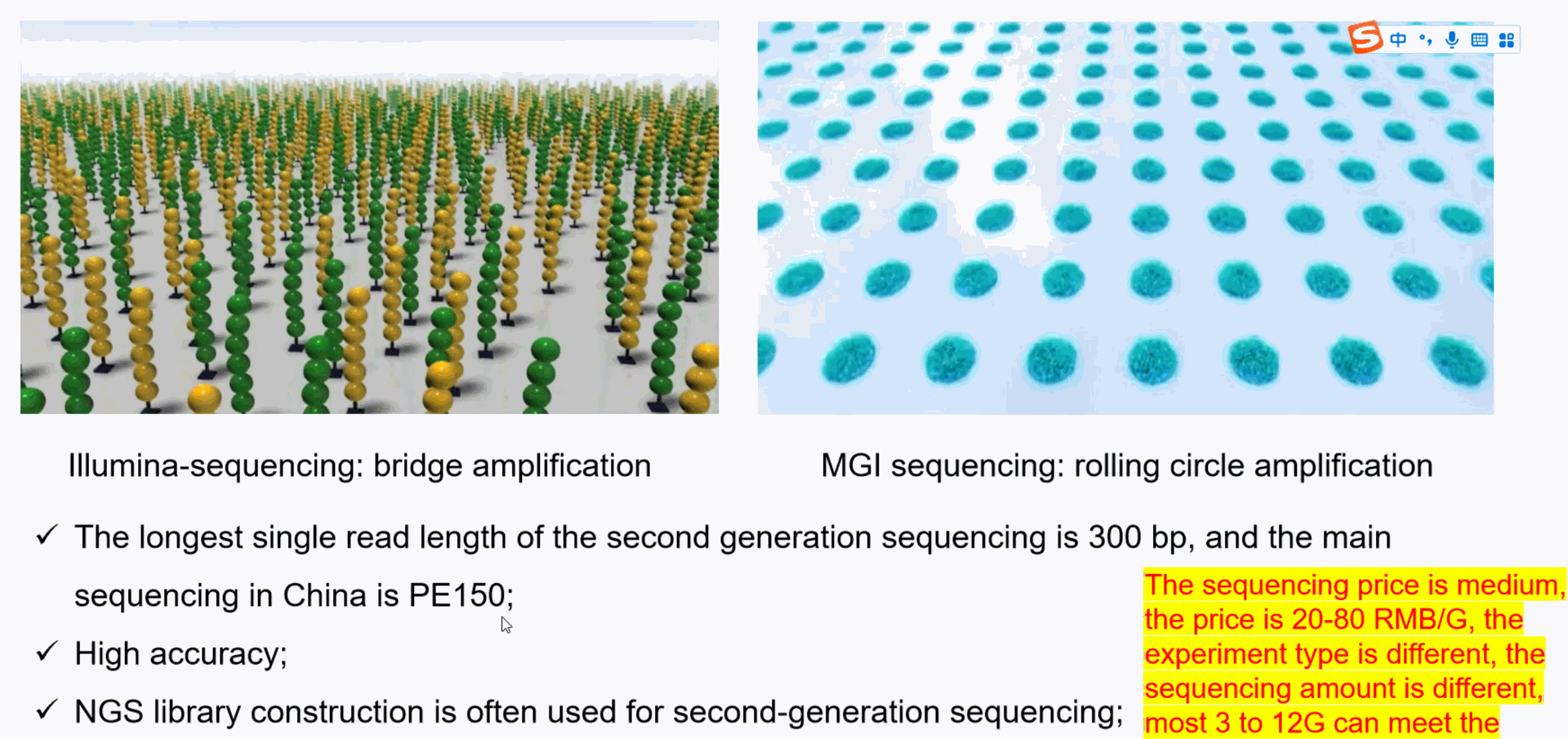 - - **Accuracy**: Sanger and Illumina are highly accurate, PacBio is accurate with post-processing, and Oxford Nanopore has lower initial accuracy but is improving.
